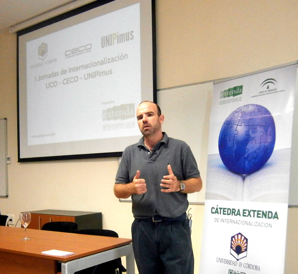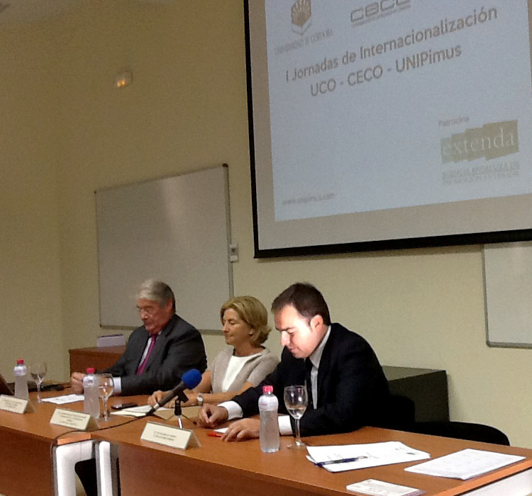 El pasado lunes día 16 de septiembre se organizó la I Jornada In-Formativa de Unipimus con UCO y CECO y patrocinada por Extenda para estudiantes erasmus y empresarios. Abrió la jornada Dña. Carmen Galán Vice-Rectora de Internacionalización y Cooperación de la UCO conjuntamente con el Presidente de la Confederación de Empresarios D. Luis Carreto, moderando uno de los tres Co-Fundadores en este caso D. Cruz Guijarro.